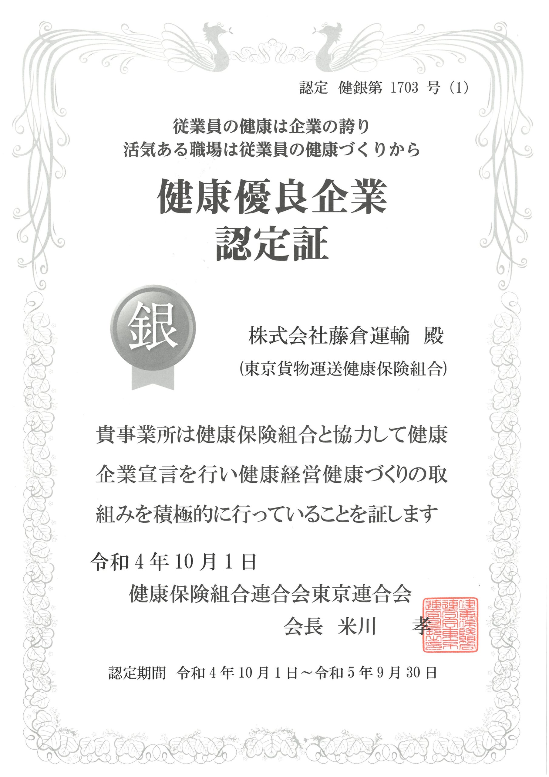 株式会社藤倉運輸は、健康保険組合連合会東京連合会より、健康企業宣言を行い健康経営健康づくりの取り組みを積極的に行っている企業として、令和3年9月1日付けで健康優良企業に認定され「銀の認定」を更新致しました。