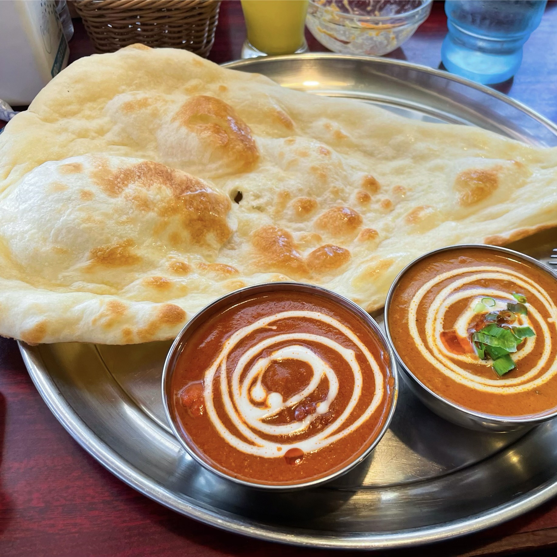 写真に写ってるのは(左)バターチキン、(右)キーマ茄子です✨