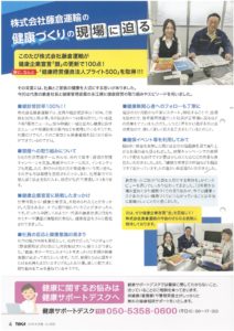 2025.08.27 健康経営 活動ブログ 健保ニュースに掲載いただきました 藤倉運輸の健康経営への取組が健保ニュース【TOKA 2025年8月号】に掲載されました☺️ これからも従業員の健康を第一に、安心して働ける職場づくりを進めてまいります💪😁 明治安田生命様の「QOL健診」を実施 前の記事 震災訓練 交通対策訓練 次の記事