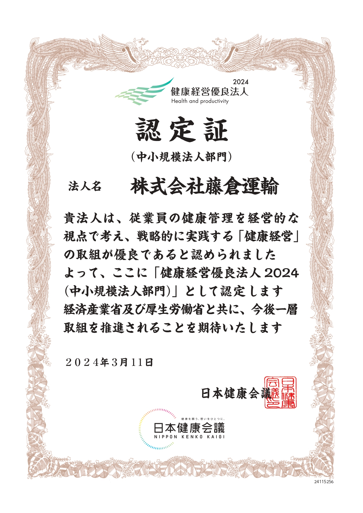 2024.03.12 健康経営優良法人2024 今年度も【健康経営優良法人2024】の認定をいただく事が出来ました😆✨ ありがとうございます。 引き続き社内の環境を整え、 社員の健康維持と増進に努めて参ります✨✨ 公式Instagramは ☞こちら😆✨ 公式Facebookは ☞こちら😆✨ 物流ウィークリー様に掲載していただきました 前の記事 CM撮影 次の記事